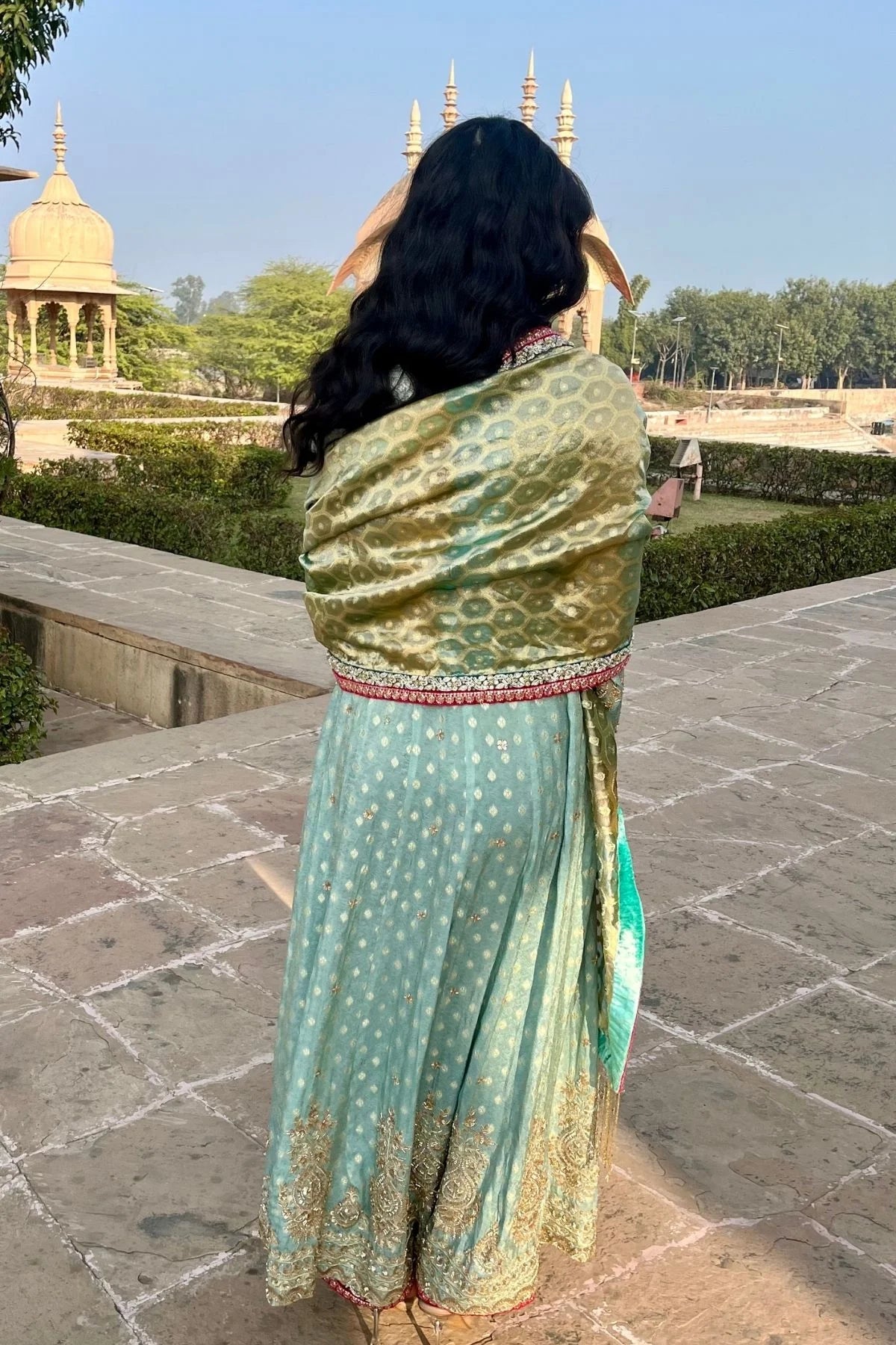 Turquoise hand embroidered anarkali suit with turquoise Banarasi tissue hand embroidered blouse and multicolored handwoven Banarasi tissue dupatta.