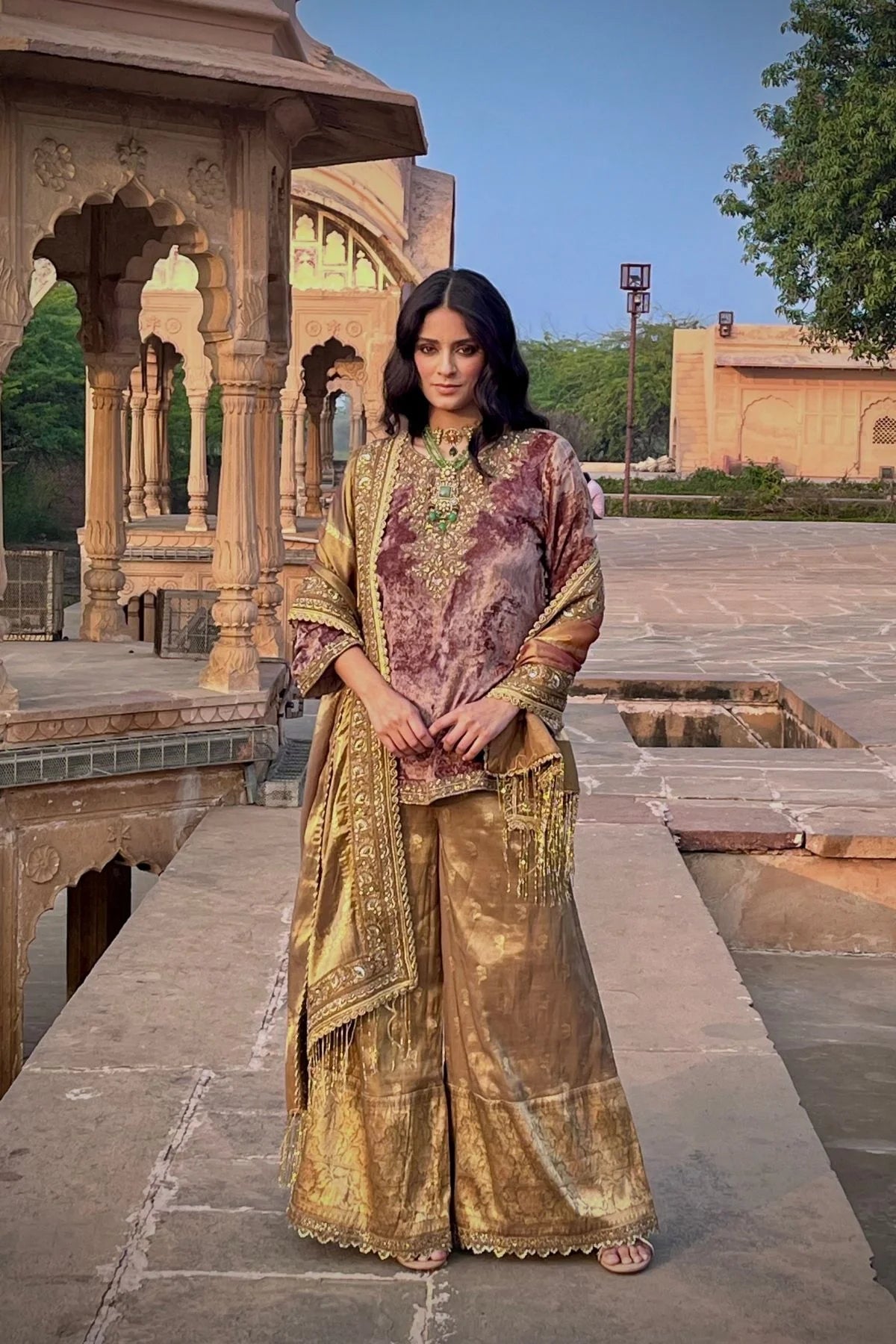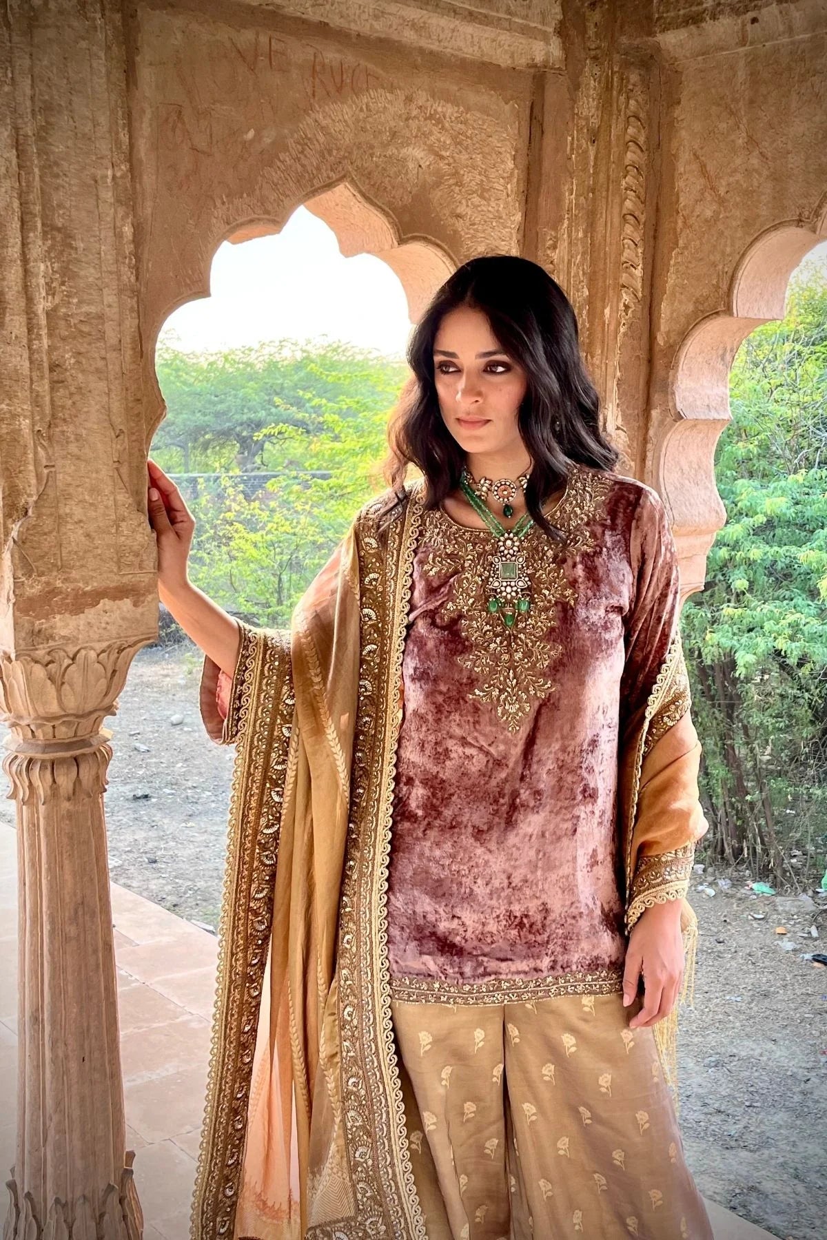 Wine velvet hand embroidered kurta with olive green Banarasi tissue handwoven dupatta and olive green handwoven tissue pants.