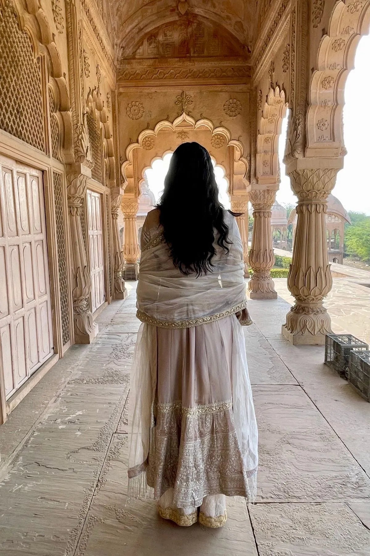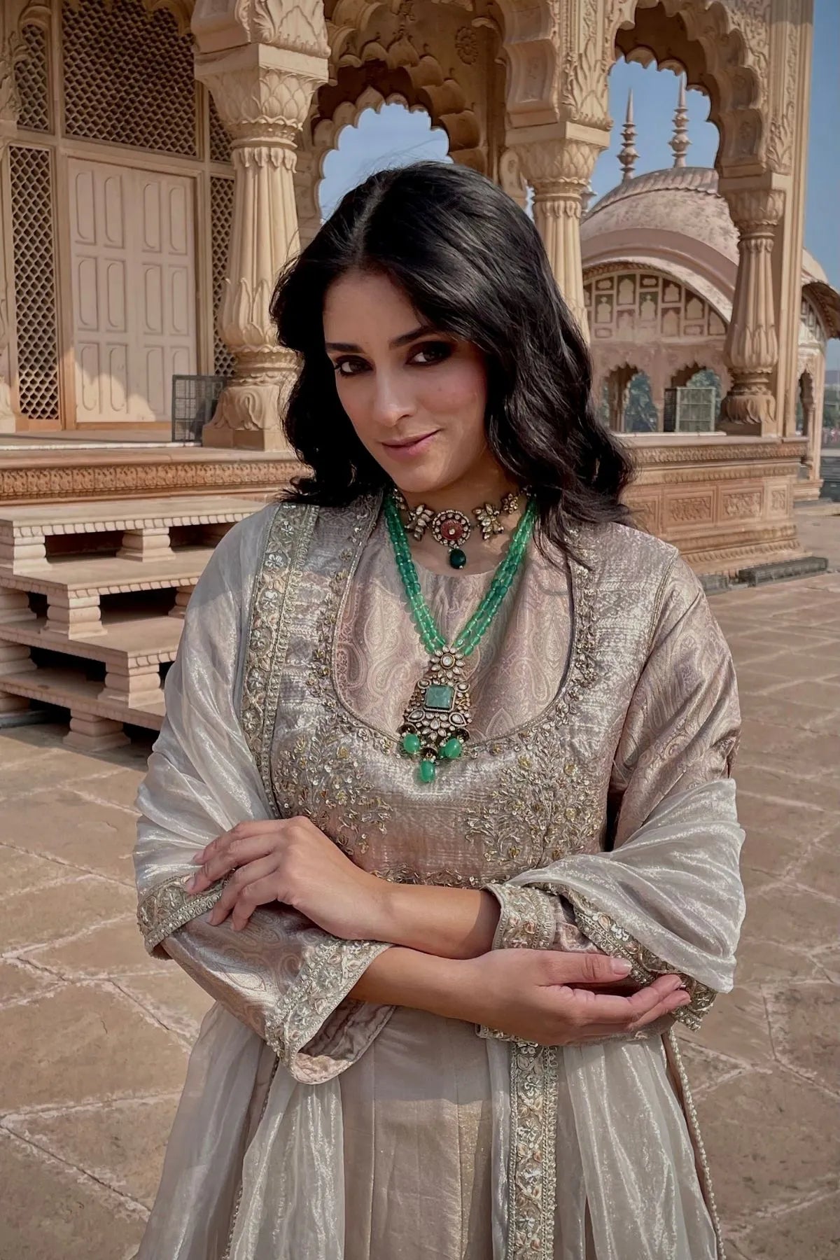 Ivory silk tissue embroidered anarkali paired with an ivory Banarasi tissue dupatta, ivory tissue pants, and an ivory tissue hand-embroidered blouse. A graceful ensemble featuring delicate embroidery and soft luxurious texture.