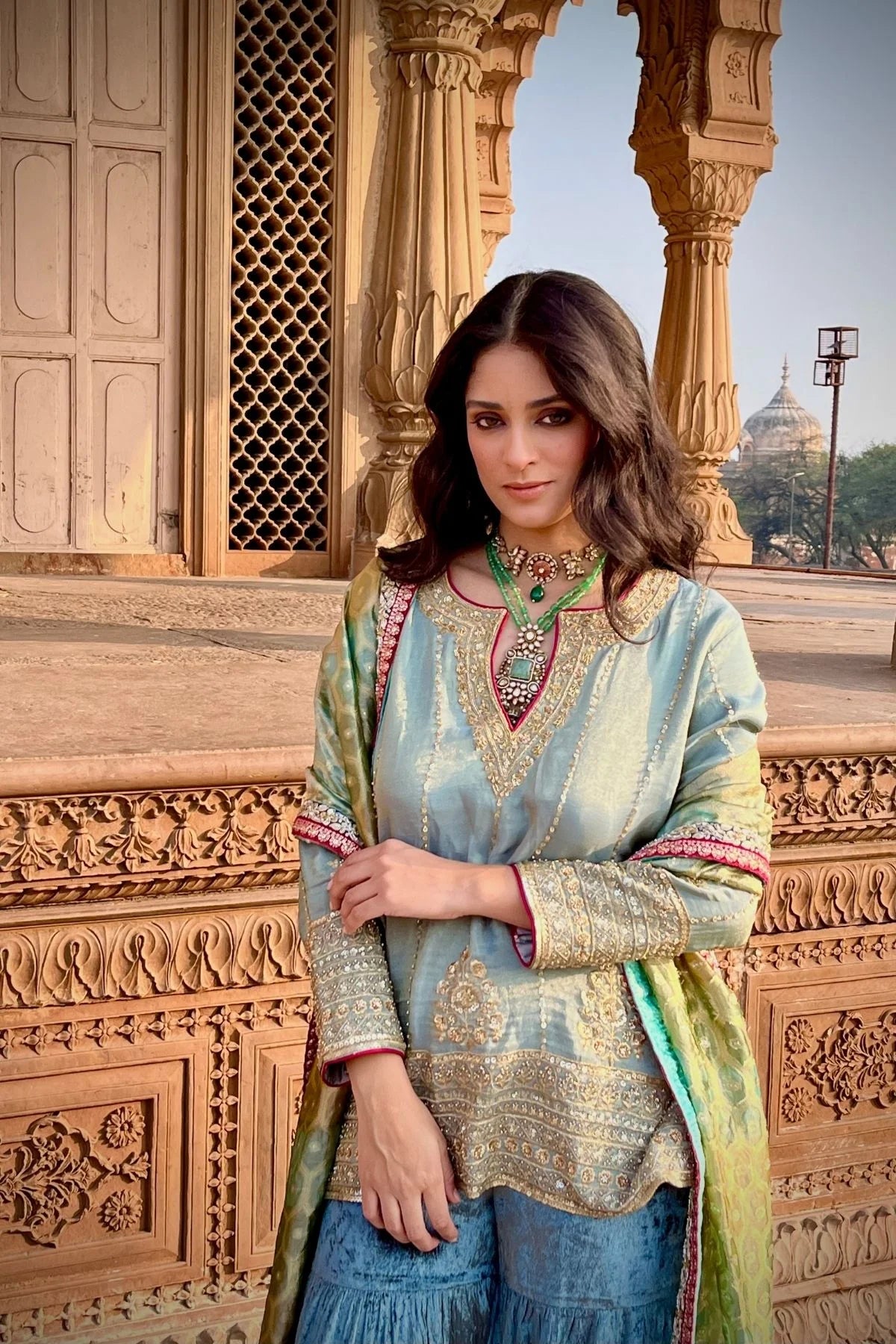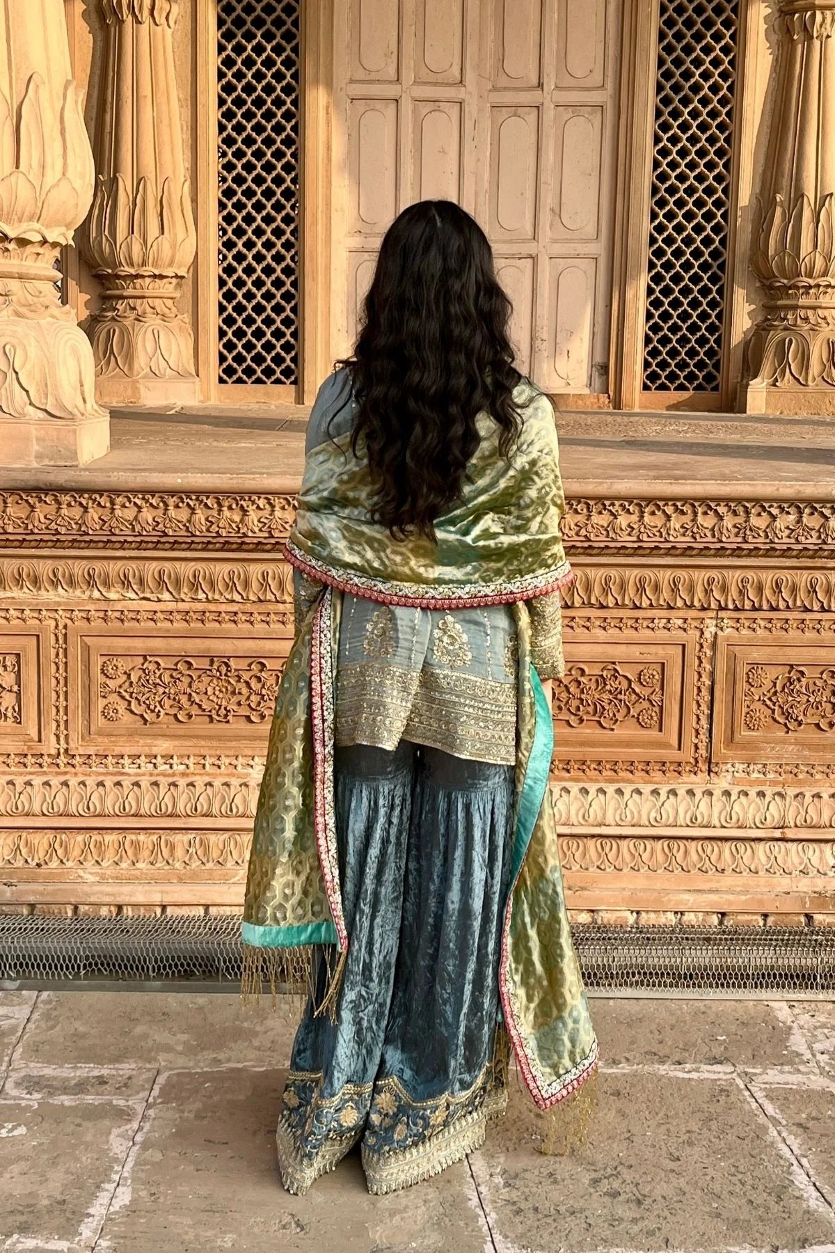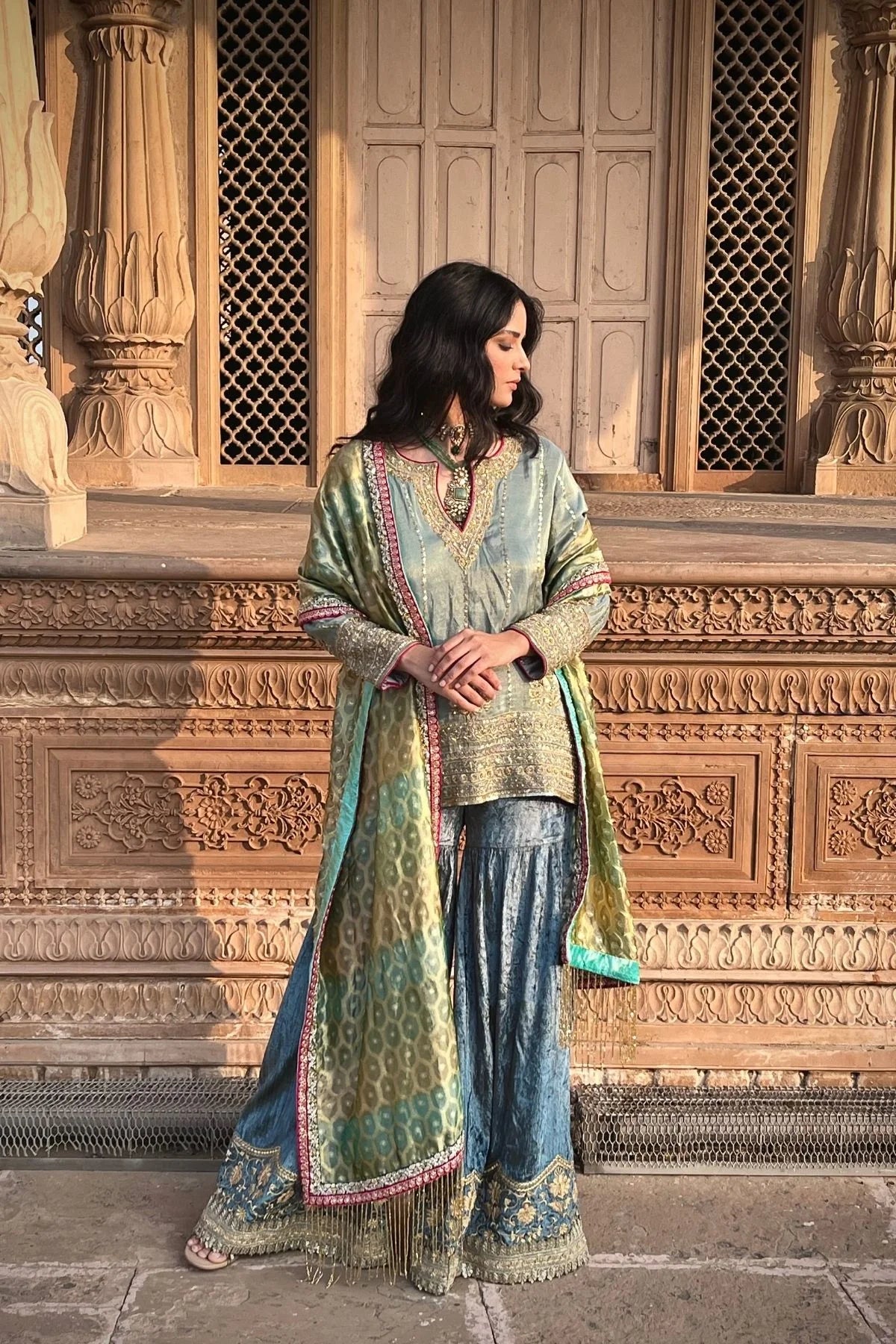 Turquoise tissue hand embroidered shirt kurta with embroidered velvet sharara pants and multicolored Banarasi tissue dupatta.
