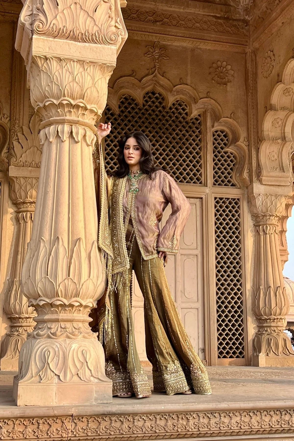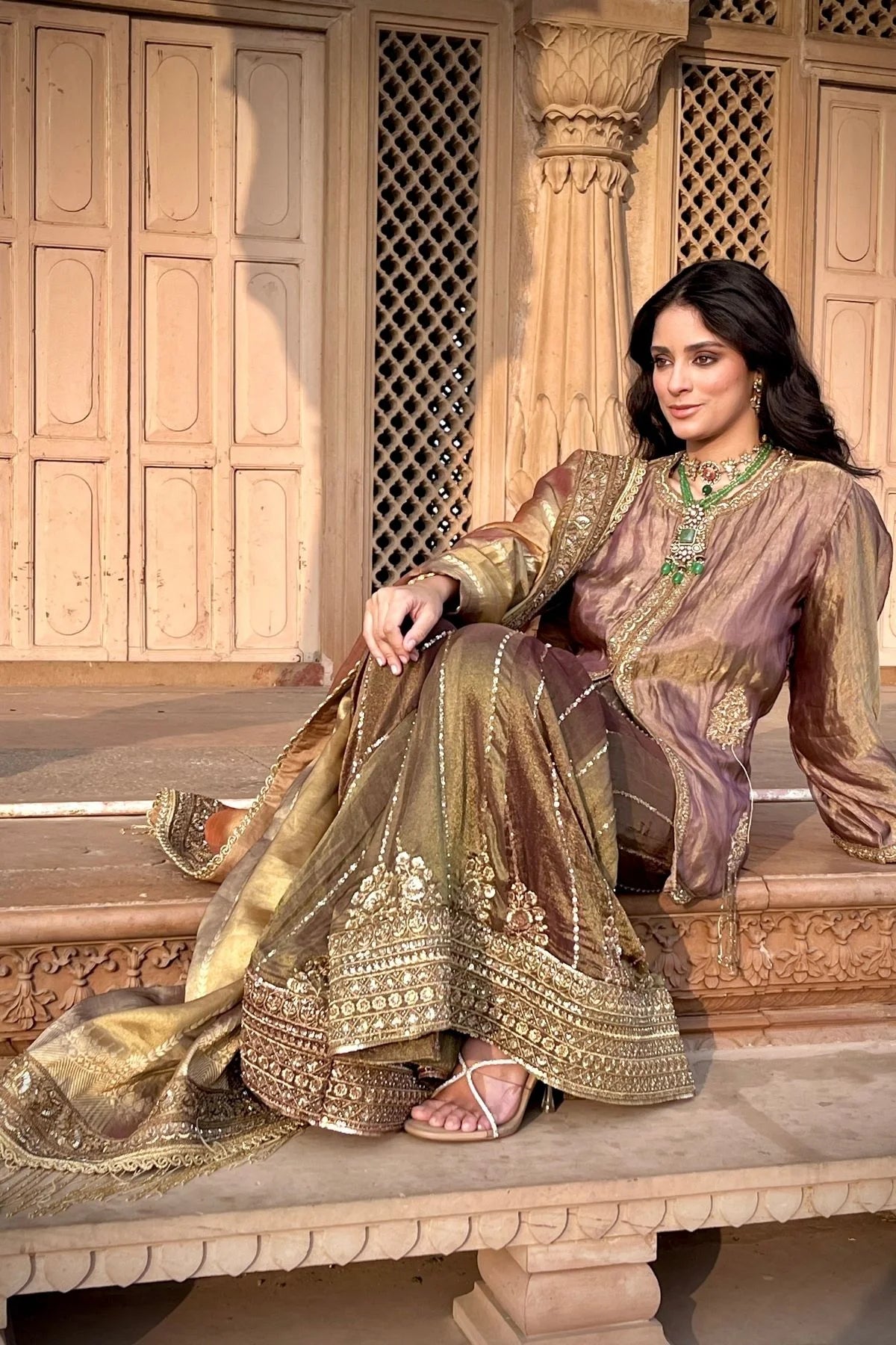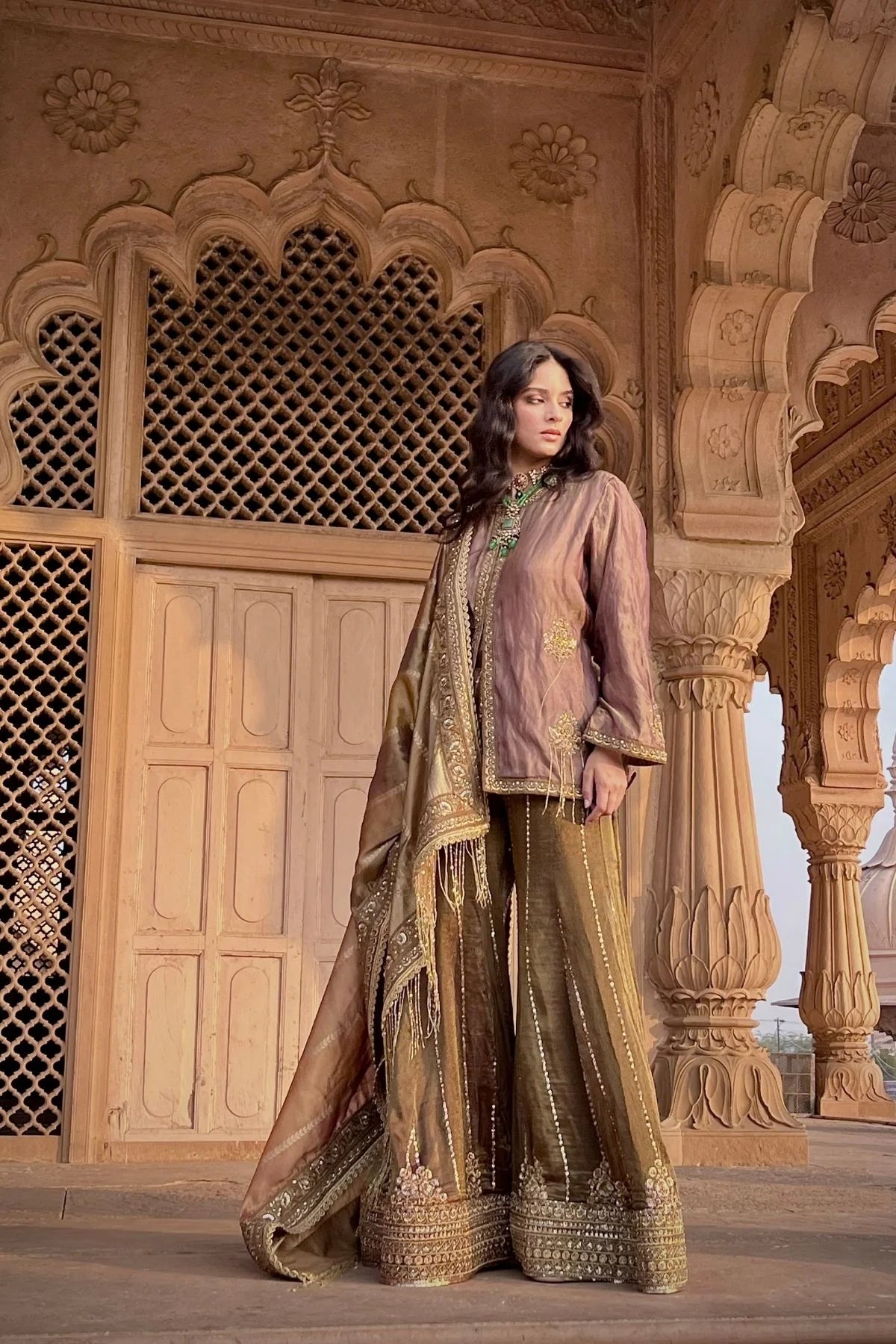 Wine tissue embroidered kurta with olive green tissue embroidered flared pants and multicolored Banarasi tissue dupatta.